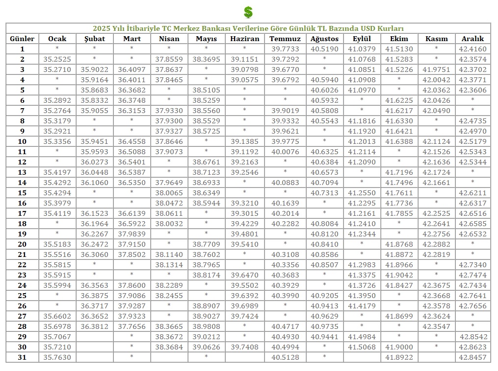 TC Merkez Bankası Verilerine Göre Günlük TL Bazında USD Döviz Alış Kurları